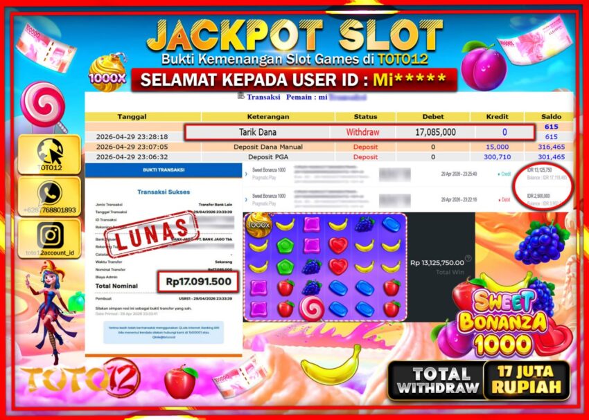 Selamat kepada Member Kami Mi***** Telah Jackpot dan berhasil mendapatkan kemenangan besar pada permainan JACKPOT SLOT GAME (SWEET BONANZA 1000) Dengan Kemenangan Sebesar Rp.17.085.000–.