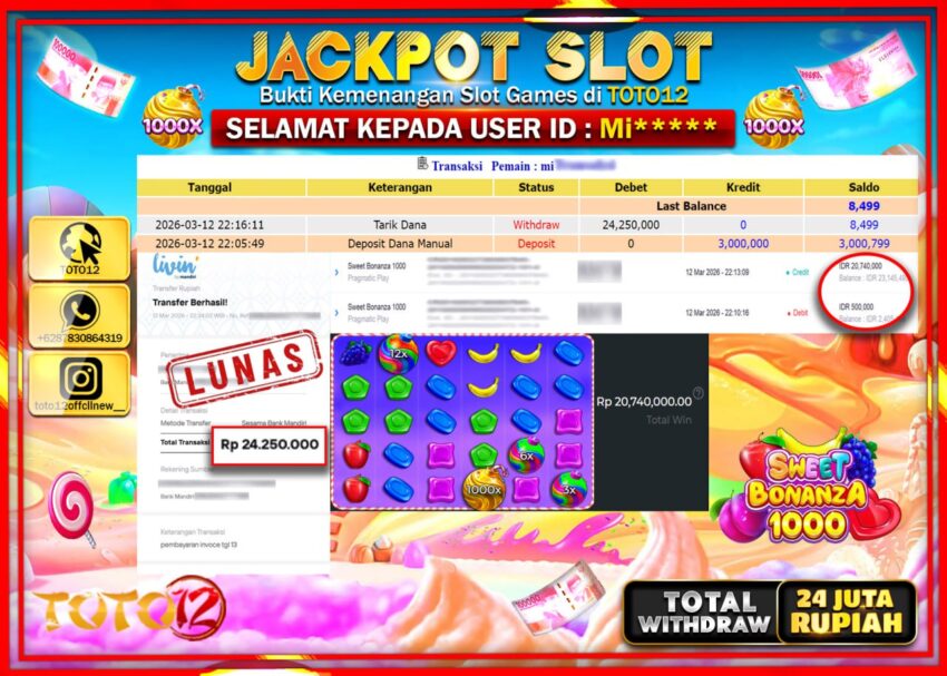 Selamat kepada Member Kami MI****** Telah Jackpot dan berhasil mendapatkan kemenangan besar pada permainan JACKPOT SLOT GAME  (SWEET BONANZA 1000)  Dengan Kemenangan Sebesar Rp.24.250.000.