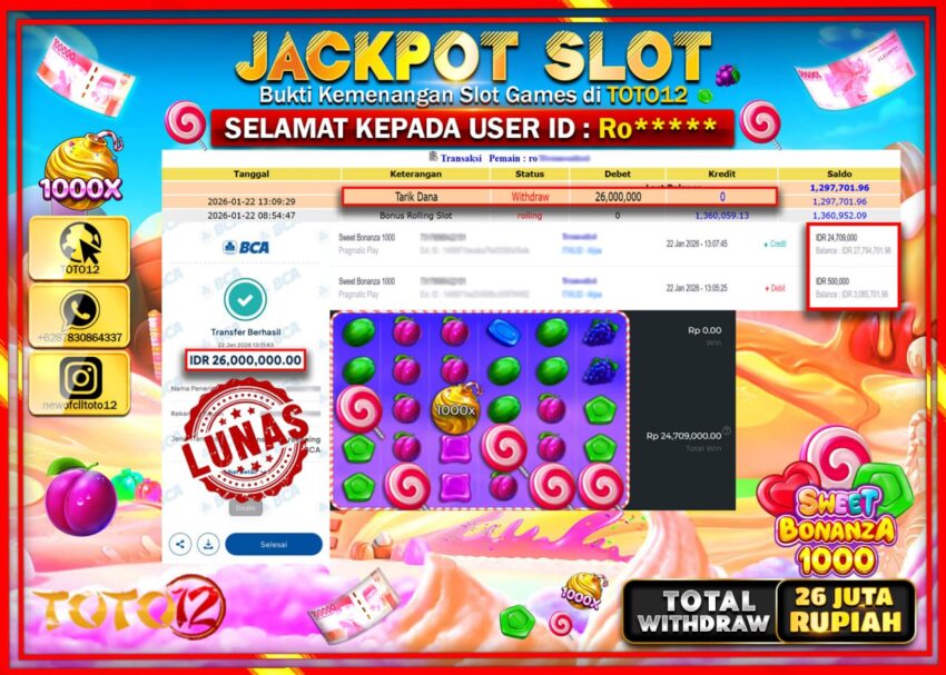 HANYA DI TOTO12 JP PASTI DI BAYAR LUNAS DAN CEPAT!!!!!! JACKPOT SLOT GAME (SWEET BONANZA 1000) Rp.26.000.000 !!!!