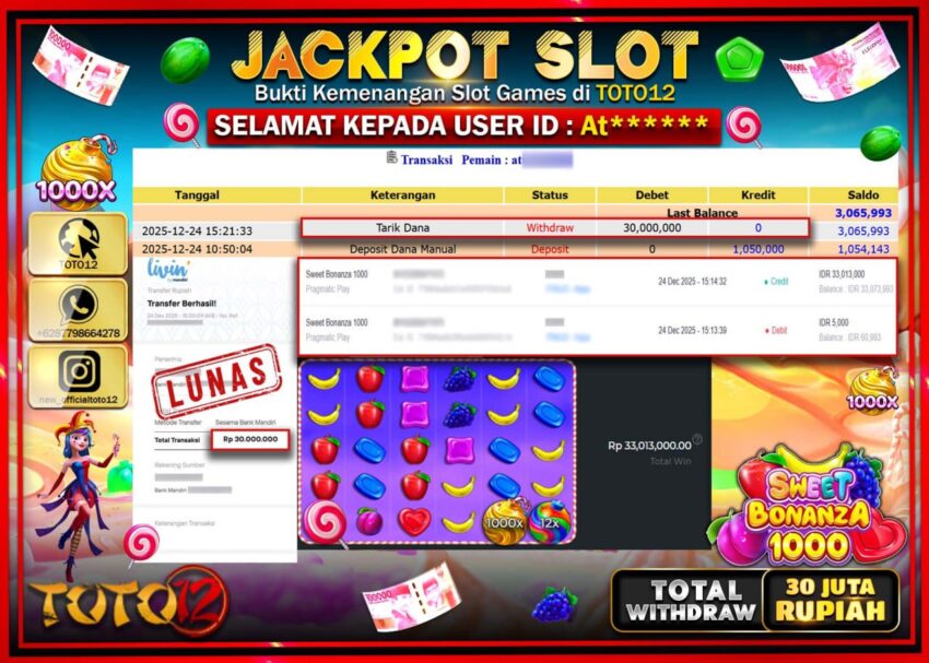 HANYA DI TOTO12 JP PASTI DI BAYAR LUNAS DAN CEPAT!!!!!! JACKPOT SLOT GAME (SWEET BONANZA 1000) Rp.30.000.000 !!!!