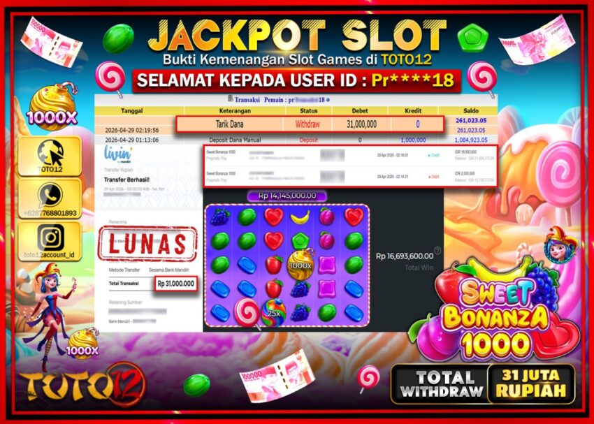 Selamat kepada Member Kami Pr*****18 Telah Jackpot dan berhasil mendapatkan kemenangan besar pada permainan JACKPOT SLOT GAME (SWEET BONANZA 1000) Dengan Kemenangan Sebesar Rp.31.000.000–.
