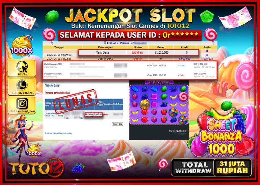 Selamat kepada Member Kami Or***** Telah Jackpot dan berhasil mendapatkan kemenangan besar pada permainan JACKPOT SLOT GAME (SWEET BONANZA 1000) Dengan Kemenangan Sebesar Rp.31.010.000–.
