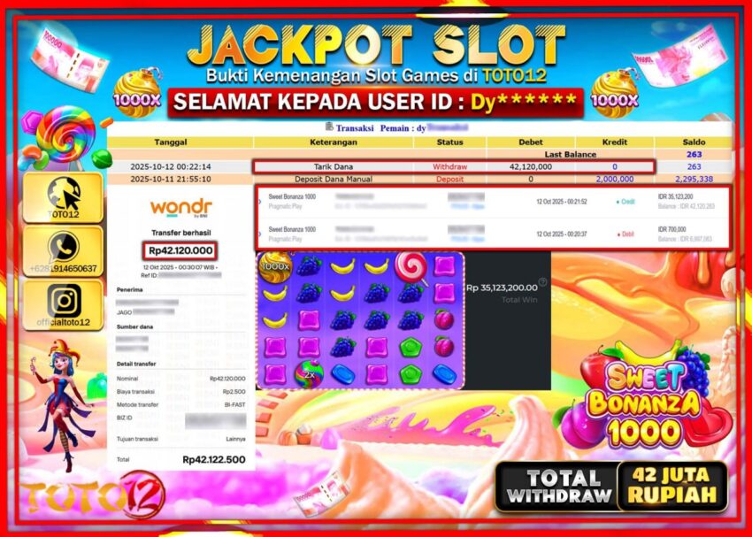 Selamat kepada Member Kami Dy****** Telah Jackpot dan berhasil mendapatkan kemenangan besar pada permainan JACKPOT SLOT GAME (SWEET BONANZA 1000) Dengan Kemenangan Sebesar Rp.42.120.000 –. Setelah mengisi Fomulir Withdraw dengan Kurang waktu 1-2 Menit Dana sudah kami Trasnfer kepada Pemilik Userid dan dana sudah dapat di cairkan oleh pemenang. Bukti Pembayaran yang TOTO12 berikan merupakan Bukti Pembayaran yang SAH / VALID yang langsung Di dapatkan melalui transaksi dari Bank yang di Tunju.