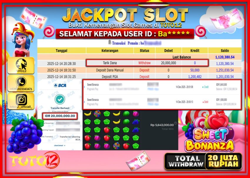 Selamat kepada Member Kami Ba****** Telah Jackpot dan berhasil mendapatkan kemenangan besar pada permainan JACKPOT SLOT GAME (SWEET BONANZA) Dengan Kemenangan Sebesar Rp.20.000.000 –.