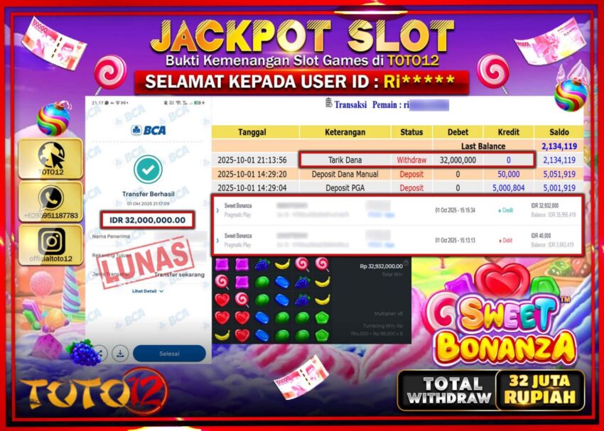 Selamat kepada Member Kami Ri****** Telah Jackpot dan berhasil mendapatkan kemenangan besar pada permainan JACKPOT SLOT GAME (SWEET BONANZA) Dengan Kemenangan Sebesar Rp.32.000.000 –. Setelah mengisi Fomulir Withdraw dengan Kurang waktu 1-2 Menit Dana sudah kami Trasnfer kepada Pemilik Userid dan dana sudah dapat di cairkan oleh pemenang. Bukti Pembayaran yang TOTO12 berikan merupakan Bukti Pembayaran yang SAH / VALID yang langsung Di dapatkan melalui transaksi dari Bank yang di Tunju.