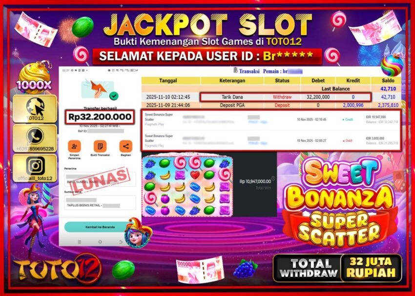 Selamat kepada Member Kami Br****** Telah Jackpot dan berhasil mendapatkan kemenangan besar pada permainan JACKPOT SLOT GAME (SWEET BONANZA SUPER SCATTER) Dengan Kemenangan Sebesar Rp.32.200.000 –. Setelah mengisi Fomulir Withdraw dengan Kurang waktu 1-2 Menit Dana sudah kami Trasnfer kepada Pemilik Userid dan dana sudah dapat di cairkan oleh pemenang. Bukti Pembayaran yang TOTO12 berikan merupakan Bukti Pembayaran yang SAH / VALID yang langsung Di dapatkan melalui transaksi dari Bank yang di Tunju.