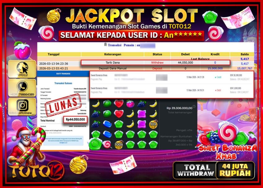 Selamat kepada Member Kami An****** Telah Jackpot dan berhasil mendapatkan kemenangan besar pada permainan JACKPOT SLOT GAME (SWEET BONANZA XMAS) Dengan Kemenangan Sebesar Rp.44.050.000.