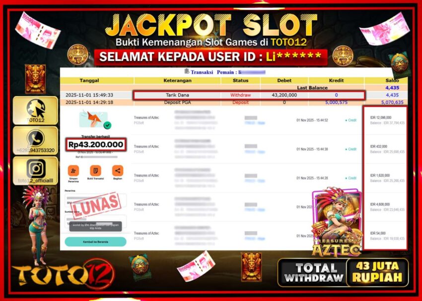 Selamat kepada Member Kami Li****** Telah Jackpot dan berhasil mendapatkan kemenangan besar pada permainan JACKPOT SLOT GAME (TREASURES AZTEC) Dengan Kemenangan Sebesar Rp.43.200.000 –. Setelah mengisi Fomulir Withdraw dengan Kurang waktu 1-2 Menit Dana sudah kami Trasnfer kepada Pemilik Userid dan dana sudah dapat di cairkan oleh pemenang. Bukti Pembayaran yang TOTO12 berikan merupakan Bukti Pembayaran yang SAH / VALID yang langsung Di dapatkan melalui transaksi dari Bank yang di Tunju.