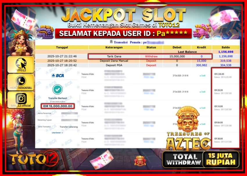 Selamat kepada Member Kami Pa****** Telah Jackpot dan berhasil mendapatkan kemenangan besar pada permainan JACKPOT SLOT GAME (TREASURES OF AZTEC) Dengan Kemenangan Sebesar Rp.15.000.000 –. Setelah mengisi Fomulir Withdraw dengan Kurang waktu 1-2 Menit Dana sudah kami Trasnfer kepada Pemilik Userid dan dana sudah dapat di cairkan oleh pemenang. Bukti Pembayaran yang TOTO12 berikan merupakan Bukti Pembayaran yang SAH / VALID yang langsung Di dapatkan melalui transaksi dari Bank yang di Tunju.