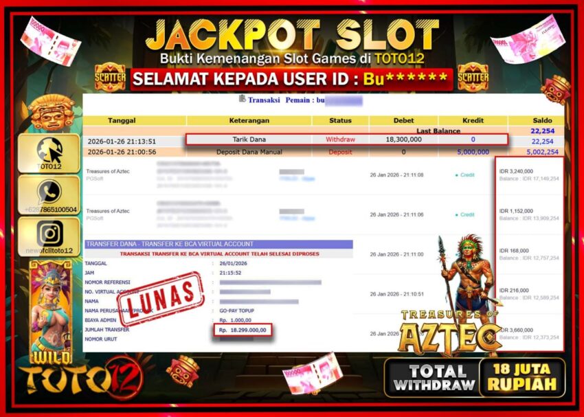 Selamat kepada Member Kami Bu****** Telah Jackpot dan berhasil mendapatkan kemenangan besar pada permainan JACKPOT SLOT GAME (TREASURES OF AZTEC) Dengan Kemenangan Sebesar Rp.18.300.000 –.