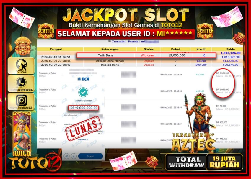 Selamat kepada Member Kami Mi***** Telah Jackpot dan berhasil mendapatkan kemenangan besar pada permainan JACKPOT SLOT GAME (TREASURES OF AZTEC) Dengan Kemenangan Sebesar Rp.19.000.000–.