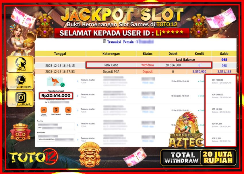 Selamat kepada Member Kami Li****** Telah Jackpot dan berhasil mendapatkan kemenangan besar pada permainan JACKPOT SLOT GAME (TREASURES OF AZTEC)  Dengan Kemenangan Sebesar Rp.20.614.000 –.