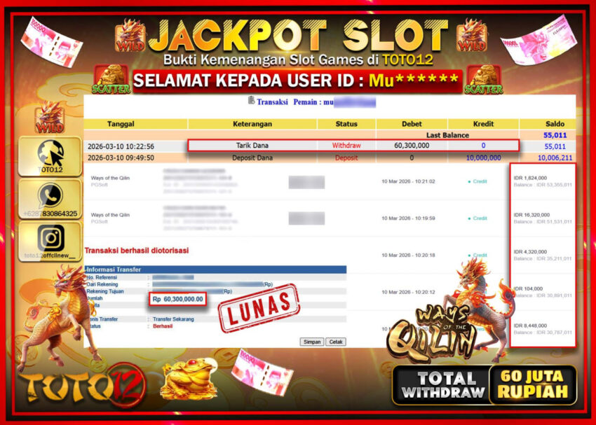 Selamat kepada Member Kami Mu**** Telah Jackpot dan berhasil mendapatkan kemenangan besar pada permainan JACKPOT SLOT GAME (WAYS OF THE QILIN) Dengan Kemenangan Sebesar Rp.60.300.000–.
