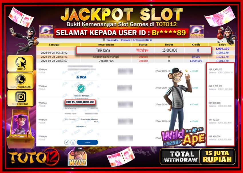 Selamat kepada Member Kami Br*****89 Telah Jackpot dan berhasil mendapatkan kemenangan besar pada permainan JACKPOT SLOT GAME (WILD APE) Dengan Kemenangan Sebesar Rp.15.000.000–.
