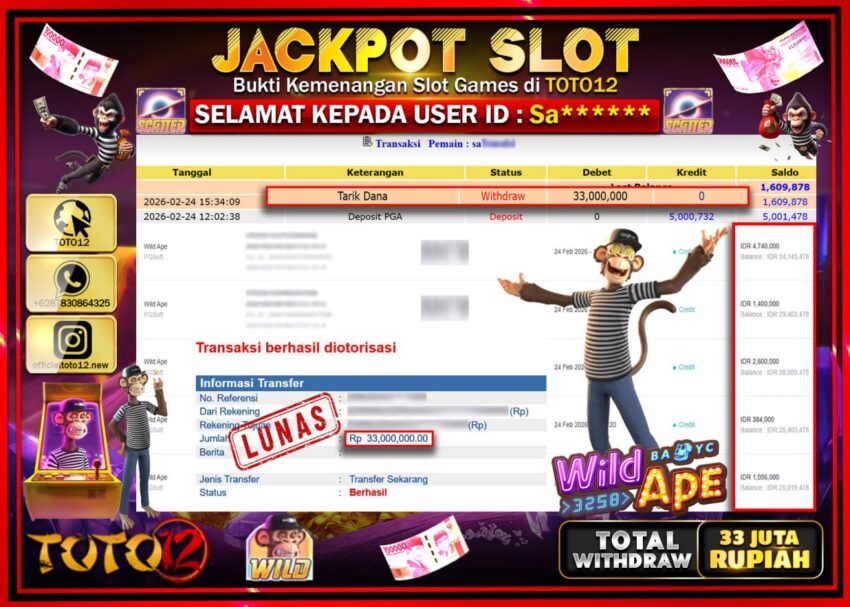 Selamat kepada Member Kami Sa***** Telah Jackpot dan berhasil mendapatkan kemenangan besar pada permainan JACKPOT SLOT GAME (WILD APE) Dengan Kemenangan Sebesar Rp.33.000.000–.