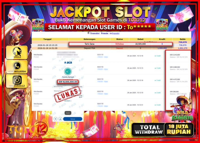 Selamat kepada Member Kami To****** Telah Jackpot dan berhasil mendapatkan kemenangan besar pada permainan JACKPOT SLOT GAME (WILD BANDITO) Dengan Kemenangan Sebesar Rp.18.505.000 –.