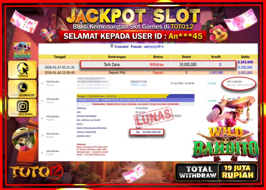 Selamat kepada Member Kami An****** Telah Jackpot dan berhasil mendapatkan kemenangan besar pada permainan JACKPOT SLOT GAME (WILD BANDITO) Dengan Kemenangan Sebesar Rp.19.000.000 –.