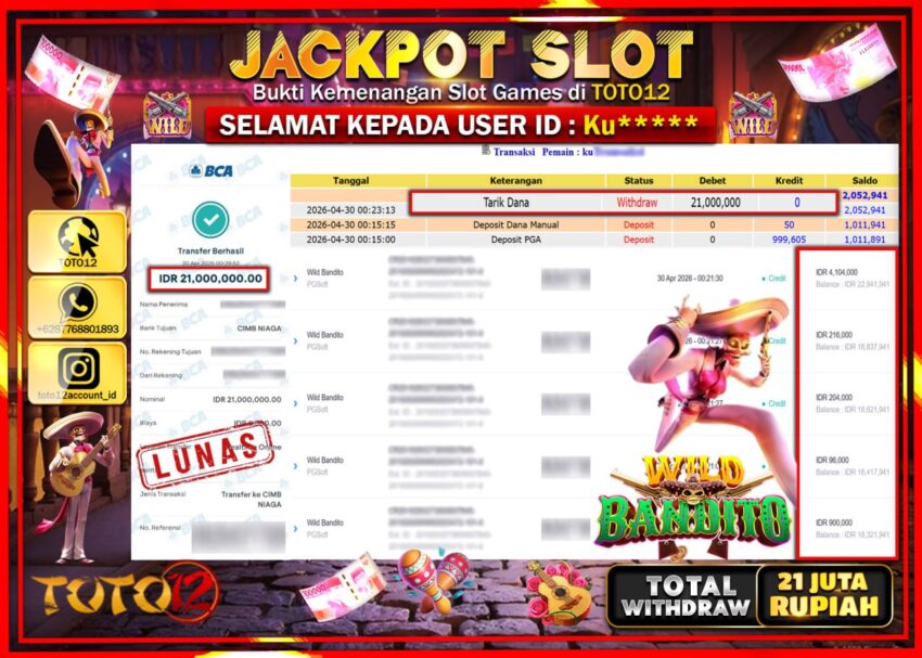 Selamat kepada Member Kami Ku***** Telah Jackpot dan berhasil mendapatkan kemenangan besar pada permainan JACKPOT SLOT GAME (WILD BANDITO) Dengan Kemenangan Sebesar Rp.21.000.000–.