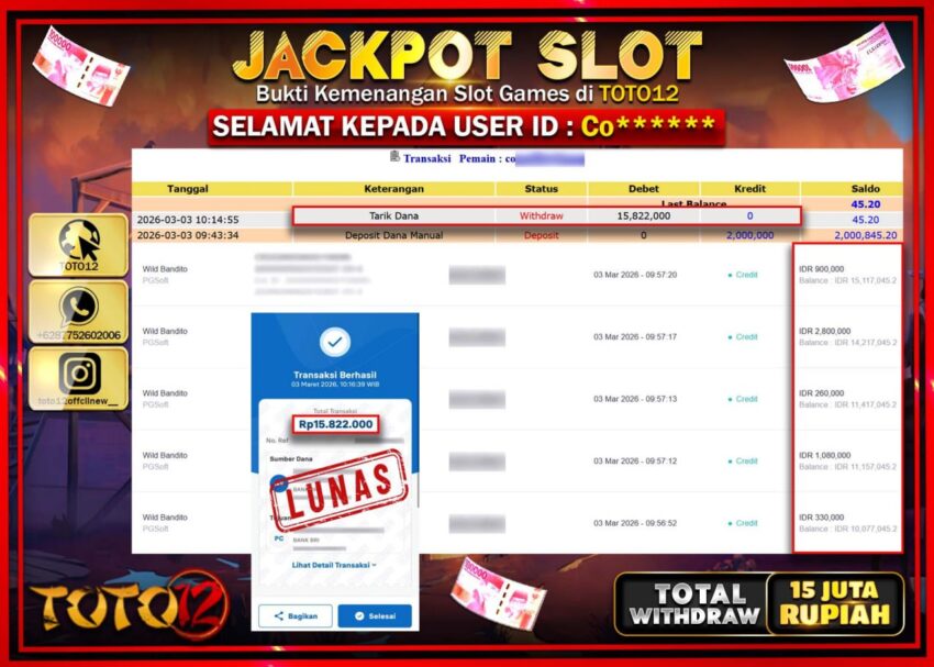 Selamat kepada Member Kami Co**** Telah Jackpot dan berhasil mendapatkan kemenangan besar pada permainan JACKPOT SLOT GAME  (WILD BANDITO SHOWDOWND)  Dengan Kemenangan Sebesar Rp.15.822.000–.
