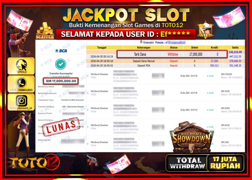 Selamat kepada Member Kami Ef***** Telah Jackpot dan berhasil mendapatkan kemenangan besar pada permainan JACKPOT SLOT GAME (WILD BOUNTY SHOWDOWN) Dengan Kemenangan Sebesar Rp.17.000.000–.
