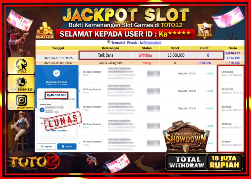 Selamat kepada Member Kami Ka***** Telah Jackpot dan berhasil mendapatkan kemenangan besar pada permainan JACKPOT SLOT GAME (WILD BOUNTY SHOWDOWN) Dengan Kemenangan Sebesar Rp.18.000.000–.