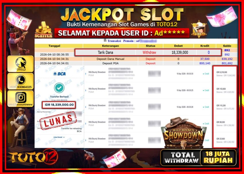Selamat kepada Member Kami Ad***** Telah Jackpot dan berhasil mendapatkan kemenangan besar pada permainan JACKPOT SLOT GAME (WILD BOUNTY SHOWDOWN) Dengan Kemenangan Sebesar Rp.18.339.000–.