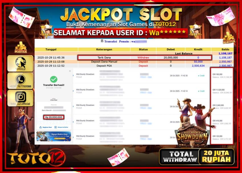 Selamat kepada Member Kami Wa****** Telah Jackpot dan berhasil mendapatkan kemenangan besar pada permainan JACKPOT SLOT GAME (WILD BOUNTY SHOWDOWN)  Dengan Kemenangan Sebesar Rp.20.000.000 –.  Setelah mengisi Fomulir Withdraw dengan Kurang waktu 1-2 Menit Dana sudah kami Trasnfer kepada Pemilik Userid dan dana sudah dapat di cairkan oleh pemenang. Bukti Pembayaran yang TOTO12 berikan merupakan Bukti Pembayaran yang  SAH / VALID yang langsung Di dapatkan melalui transaksi dari Bank yang di Tunju.