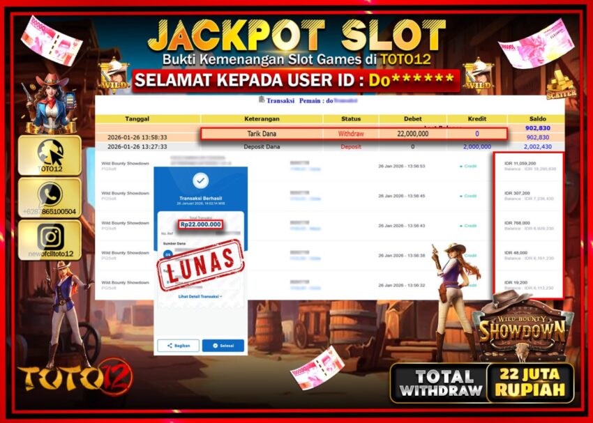 Selamat kepada Member Kami Do****** Telah Jackpot dan berhasil mendapatkan kemenangan besar pada permainan JACKPOT SLOT GAME (WILD BOUNTY SHOWDOWN) Dengan Kemenangan Sebesar Rp.22.000.000 –.