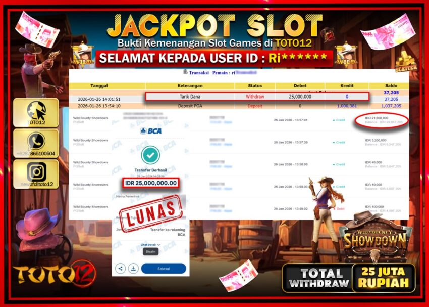 Selamat kepada Member Kami Ri****** Telah Jackpot dan berhasil mendapatkan kemenangan besar pada permainan JACKPOT SLOT GAME (WILD BOUNTY SHOWDOWN) Dengan Kemenangan Sebesar Rp.25.000.000 –.