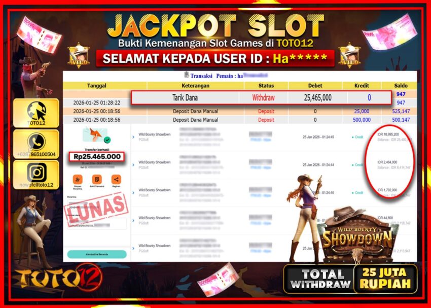 Selamat kepada Member Kami Ha****** Telah Jackpot dan berhasil mendapatkan kemenangan besar pada permainan JACKPOT SLOT GAME (WILD BOUNTY SHOWDOWN) Dengan Kemenangan Sebesar Rp.25.465.000 –.