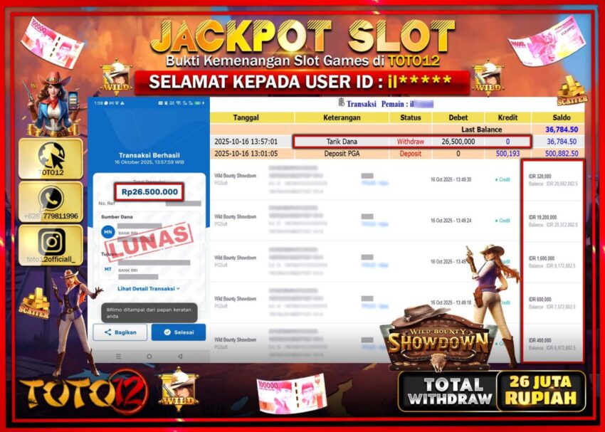 Selamat kepada Member Kami Il****** Telah Jackpot dan berhasil mendapatkan kemenangan besar pada permainan JACKPOT SLOT GAME (WILD BOUNTY SHOWDOWN)  Dengan Kemenangan Sebesar Rp.26.500.000 –.  Setelah mengisi Fomulir Withdraw dengan Kurang waktu 1-2 Menit Dana sudah kami Trasnfer kepada Pemilik Userid dan dana sudah dapat di cairkan oleh pemenang. Bukti Pembayaran yang TOTO12 berikan merupakan Bukti Pembayaran yang  SAH / VALID yang langsung Di dapatkan melalui transaksi dari Bank yang di Tunju.