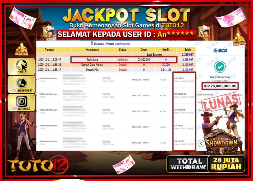 Selamat kepada Member Kami An****** Telah Jackpot dan berhasil mendapatkan kemenangan besar pada permainan JACKPOT SLOT GAME (WILD BOUNTY SHOWDOWN) Dengan Kemenangan Sebesar Rp.28.800.000 –. Setelah mengisi Fomulir Withdraw dengan Kurang waktu 1-2 Menit Dana sudah kami Trasnfer kepada Pemilik Userid dan dana sudah dapat di cairkan oleh pemenang. Bukti Pembayaran yang TOTO12 berikan merupakan Bukti Pembayaran yang SAH / VALID yang langsung Di dapatkan melalui transaksi dari Bank yang di Tunju.