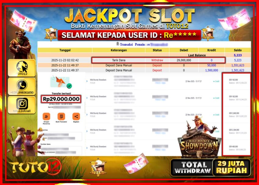 Selamat kepada Member Kami Re****** Telah Jackpot dan berhasil mendapatkan kemenangan besar pada permainan JACKPOT SLOT GAME (WILD BOUNTY SHOWDOWN) Dengan Kemenangan Sebesar Rp.29.000.000 –. Setelah mengisi Fomulir Withdraw dengan Kurang waktu 1-2 Menit Dana sudah kami Trasnfer kepada Pemilik Userid dan dana sudah dapat di cairkan oleh pemenang. Bukti Pembayaran yang TOTO12 berikan merupakan Bukti Pembayaran yang SAH / VALID yang langsung Di dapatkan melalui transaksi dari Bank yang di Tunju.