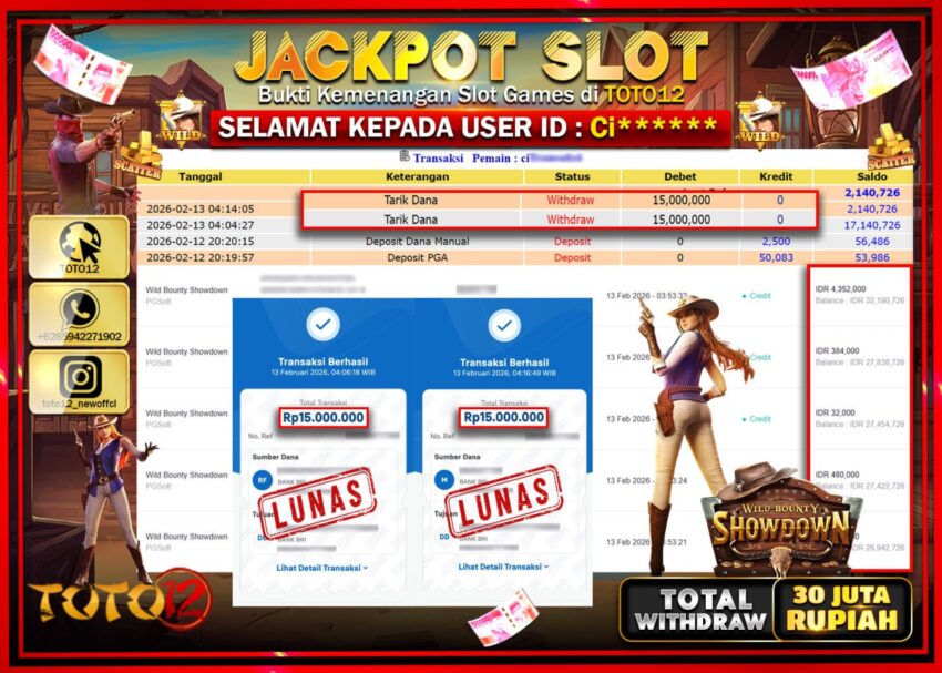 Selamat kepada Member Kami Ci******  Telah Jackpot dan berhasil mendapatkan kemenangan besar pada permainan JACKPOT SLOT GAME  (WILD BOUNTY SHOWDOWN)  Dengan Kemenangan Sebesar Rp.30.000.000–.