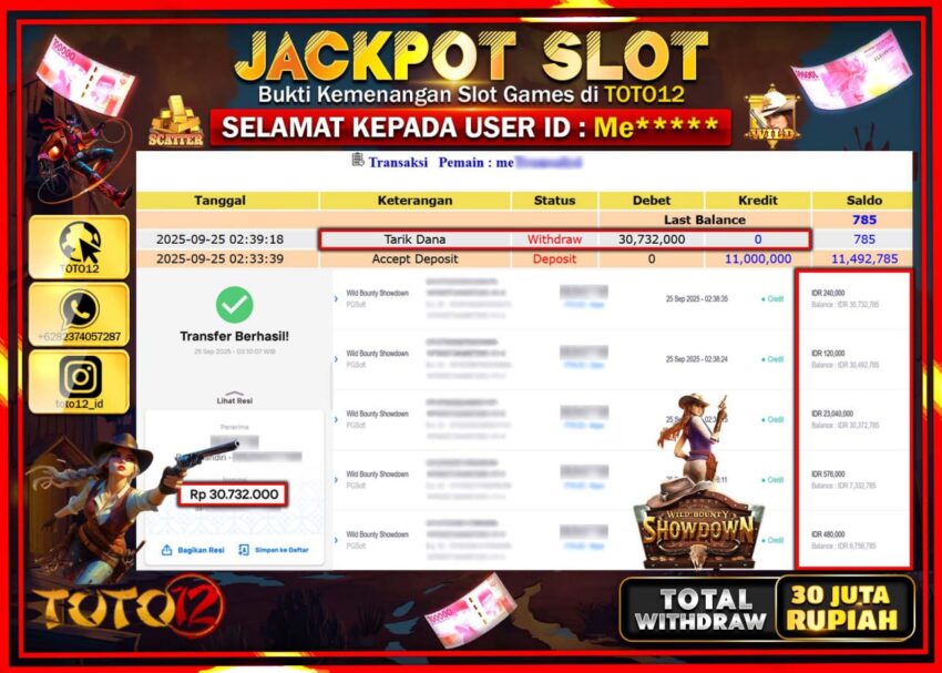 Selamat kepada Member Kami Me****** Telah Jackpot dan berhasil mendapatkan kemenangan besar pada permainan JACKPOT SLOT GAME (WILD BOUNTY SHOWDOWN)  Dengan Kemenangan Sebesar Rp.30.732.000 –.  Setelah mengisi Fomulir Withdraw dengan Kurang waktu 1-2 Menit Dana sudah kami Trasnfer kepada Pemilik Userid dan dana sudah dapat di cairkan oleh pemenang. Bukti Pembayaran yang TOTO12 berikan merupakan Bukti Pembayaran yang  SAH / VALID yang langsung Di dapatkan melalui transaksi dari Bank yang di Tunju.