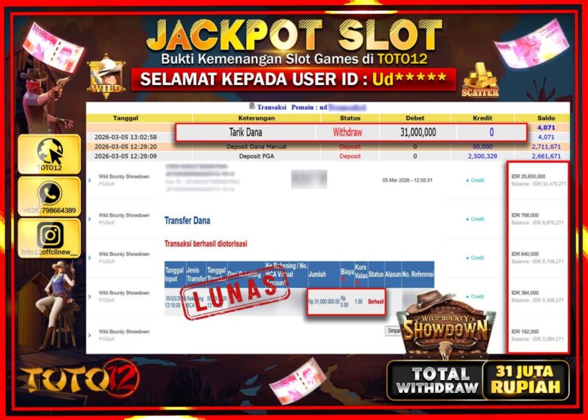 Selamat kepada Member Kami Ud**** Telah Jackpot dan berhasil mendapatkan kemenangan besar pada permainan JACKPOT SLOT GAME (WILD BOUNTY SHOWDOWN) Dengan Kemenangan Sebesar Rp.31.000.000–.