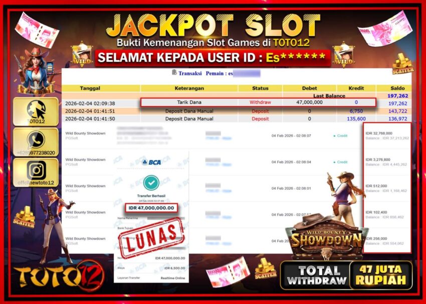 Selamat kepada Member Kami Es****** Telah Jackpot dan berhasil mendapatkan kemenangan besar pada permainan JACKPOT SLOT GAME (WILD BOUNTY SHOWDOWN)  Dengan Kemenangan Sebesar Rp.47.000.000 –.