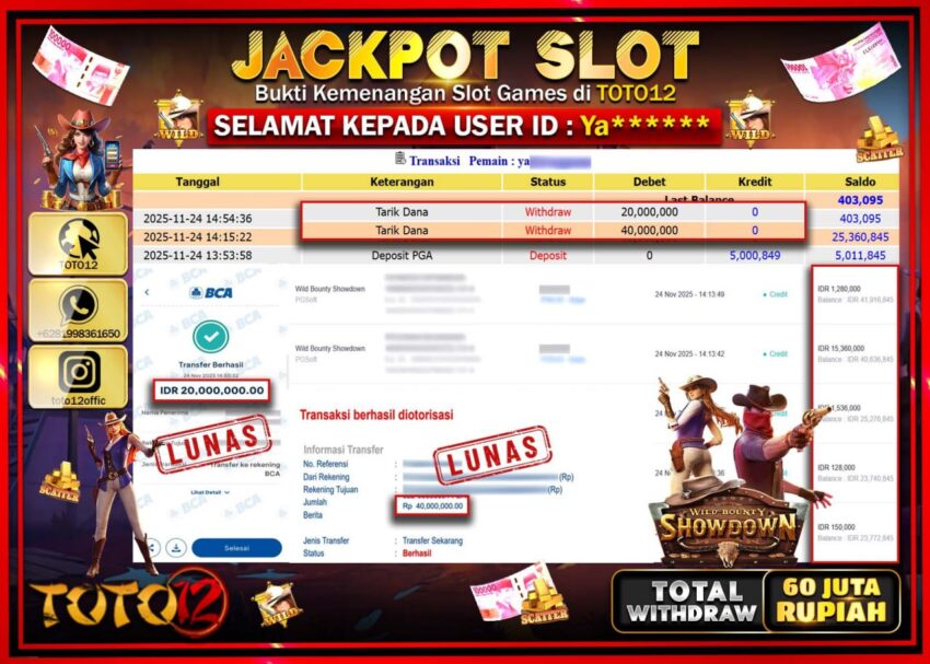 Selamat kepada Member Kami Ya****** Telah Jackpot dan berhasil mendapatkan kemenangan besar pada permainan JACKPOT SLOT GAME (WILD BOUNTY SHOWDOWN)  Dengan Kemenangan Sebesar Rp.60.000.000 –.
