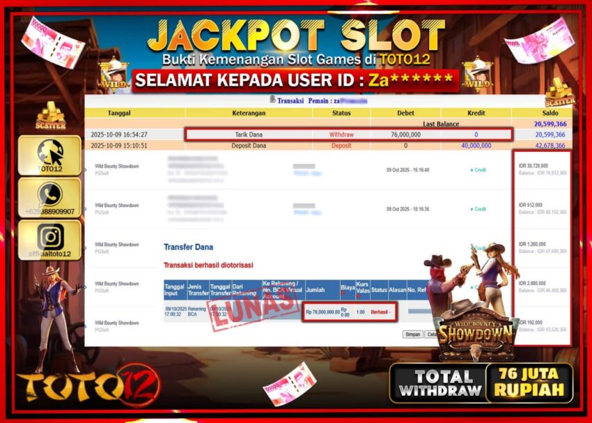 Selamat kepada Member Kami Za****** Telah Jackpot dan berhasil mendapatkan kemenangan besar pada permainan JACKPOT SLOT GAME (WILD BOUNTY SHOWDOWN)  Dengan Kemenangan Sebesar Rp.76.000.000 –.  Setelah mengisi Fomulir Withdraw dengan Kurang waktu 1-2 Menit Dana sudah kami Trasnfer kepada Pemilik Userid dan dana sudah dapat di cairkan oleh pemenang. Bukti Pembayaran yang TOTO12 berikan merupakan Bukti Pembayaran yang  SAH / VALID yang langsung Di dapatkan melalui transaksi dari Bank yang di Tunju.