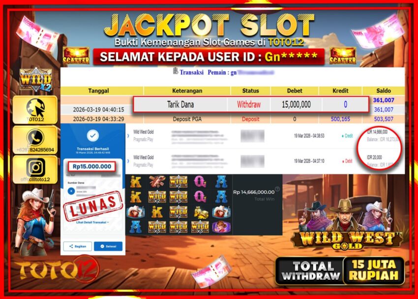 Selamat kepada Member Kami Gn**** Telah Jackpot dan berhasil mendapatkan kemenangan besar pada permainan JACKPOT SLOT GAME (WILD WEST GOLD) Dengan Kemenangan Sebesar Rp.15.000.000–.