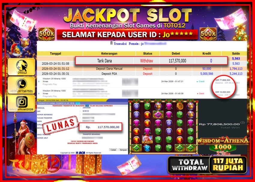 Selamat kepada Member Kami Jo**** Telah Jackpot dan berhasil mendapatkan kemenangan besar pada permainan JACKPOT SLOT GAME  (WISDOM OF ATHENA 1000)  Dengan Kemenangan Sebesar Rp.117.570.000–.