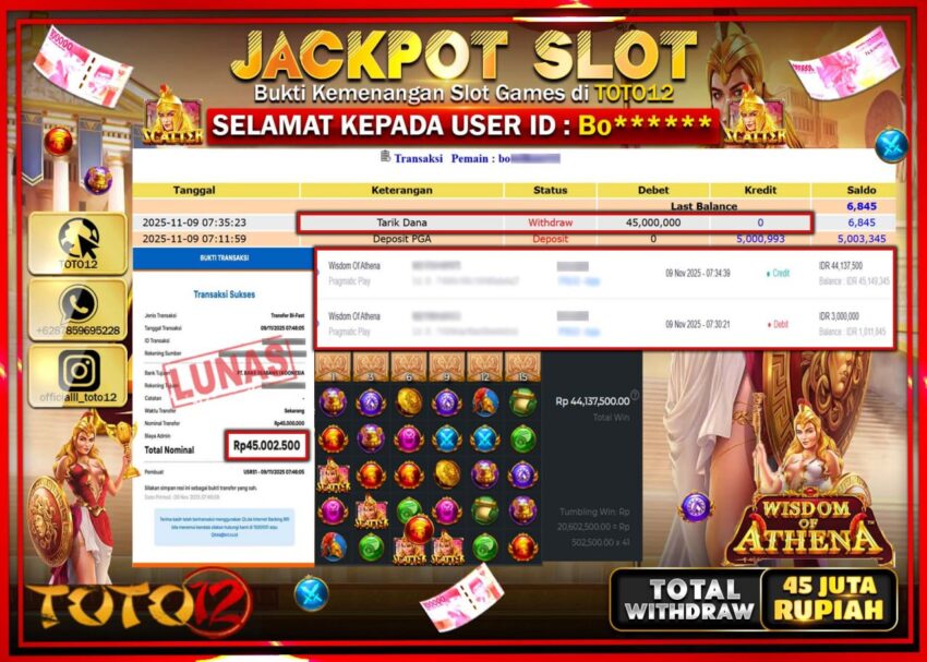 Selamat kepada Member Kami Bo****** Telah Jackpot dan berhasil mendapatkan kemenangan besar pada permainan JACKPOT SLOT GAME (WISDOM OF ATHENA)  Dengan Kemenangan Sebesar Rp.45.000.000 –.  Setelah mengisi Fomulir Withdraw dengan Kurang waktu 1-2 Menit Dana sudah kami Trasnfer kepada Pemilik Userid dan dana sudah dapat di cairkan oleh pemenang. Bukti Pembayaran yang TOTO12 berikan merupakan Bukti Pembayaran yang  SAH / VALID yang langsung Di dapatkan melalui transaksi dari Bank yang di Tunju.