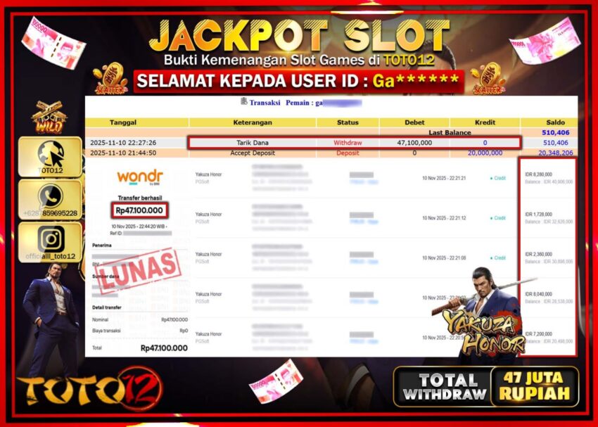 Selamat kepada Member Kami Ga****** Telah Jackpot dan berhasil mendapatkan kemenangan besar pada permainan JACKPOT SLOT GAME (YAKUZA HONOR)  Dengan Kemenangan Sebesar Rp.47.100.000 –.  Setelah mengisi Fomulir Withdraw dengan Kurang waktu 1-2 Menit Dana sudah kami Trasnfer kepada Pemilik Userid dan dana sudah dapat di cairkan oleh pemenang. Bukti Pembayaran yang TOTO12 berikan merupakan Bukti Pembayaran yang  SAH / VALID yang langsung Di dapatkan melalui transaksi dari Bank yang di Tunju.