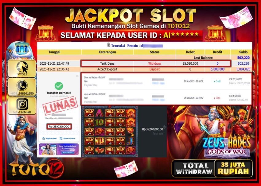 Selamat kepada Member Kami Al****** Telah Jackpot dan berhasil mendapatkan kemenangan besar pada permainan JACKPOT SLOT GAME (ZEUS VS HADES GOLDS OF WAR)  Dengan Kemenangan Sebesar Rp.35.030.000 –.  Setelah mengisi Fomulir Withdraw dengan Kurang waktu 1-2 Menit Dana sudah kami Trasnfer kepada Pemilik Userid dan dana sudah dapat di cairkan oleh pemenang. Bukti Pembayaran yang TOTO12 berikan merupakan Bukti Pembayaran yang  SAH / VALID yang langsung Di dapatkan melalui transaksi dari Bank yang di Tunju.