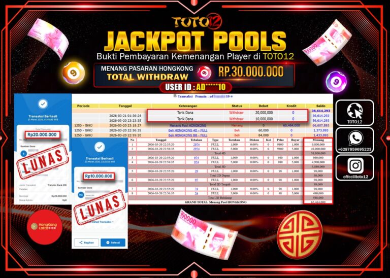 Selamat kepada Member Kami AD*****10 Telah Jackpot dan berhasil mendapatkan kemenangan besar pada permainan JACKPOT POOLS PASARAN (HONGKONG) Dengan Kemenangan Sebesar Rp.30.000.000–. Setelah mengisi Fomulir Withdraw dengan Kurang waktu 1-2 Menit Dana sudah kami Trasnfer kepada Pemilik Userid dan dana sudah dapat di cairkan oleh pemenang. Bukti Pembayaran yang TOTO12 berikan merupakan Bukti Pembayaran yang SAH /…