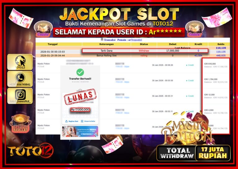 Selamat kepada Member Kami Ar****** Telah Jackpot dan berhasil mendapatkan kemenangan besar pada permainan JACKPOT SLOT GAME (MYSTIC POTION) Dengan Kemenangan Sebesar Rp.17.000.000 –. Setelah mengisi Fomulir Withdraw dengan Kurang waktu 1-2 Menit Dana sudah kami Trasnfer kepada Pemilik Userid dan dana sudah dapat di cairkan oleh pemenang. Bukti Pembayaran yang TOTO12 berikan merupakan Bukti Pembayaran…