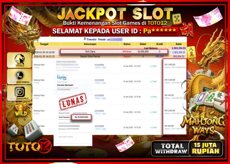 Selamat kepada Member Kami Pa****** Telah Jackpot dan berhasil mendapatkan kemenangan besar pada permainan JACKPOT SLOT GAME (MAHJONG WAYS) Dengan Kemenangan Sebesar Rp.15.000.000 –. Setelah mengisi Fomulir Withdraw dengan Kurang waktu 1-2 Menit Dana sudah kami Trasnfer kepada Pemilik Userid dan dana sudah dapat di cairkan oleh pemenang. Bukti Pembayaran yang TOTO12 berikan merupakan Bukti Pembayaran…