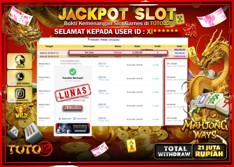 Selamat kepada Member Kami Xi****** Telah Jackpot dan berhasil mendapatkan kemenangan besar pada permainan JACKPOT SLOT GAME (MAHJONG WAYS) Dengan Kemenangan Sebesar Rp.21.000.000 –. Setelah mengisi Fomulir Withdraw dengan Kurang waktu 1-2 Menit Dana sudah kami Trasnfer kepada Pemilik Userid dan dana sudah dapat di cairkan oleh pemenang. Bukti Pembayaran yang TOTO12 berikan merupakan Bukti Pembayaran…