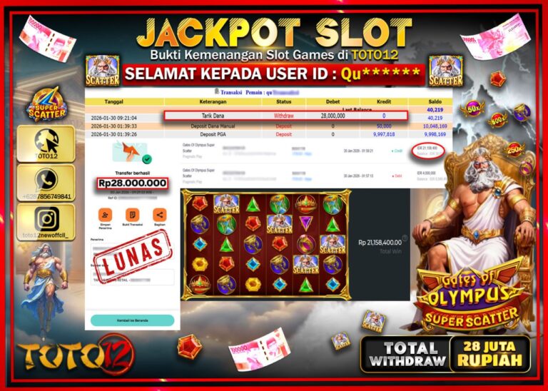 Selamat kepada Member Kami Qu****** Telah Jackpot dan berhasil mendapatkan kemenangan besar pada permainan JACKPOT SLOT GAME (GATES OF OLYMPUS SUPER SCATTER) Dengan Kemenangan Sebesar Rp.28.000.000 –. Setelah mengisi Fomulir Withdraw dengan Kurang waktu 1-2 Menit Dana sudah kami Trasnfer kepada Pemilik Userid dan dana sudah dapat di cairkan oleh pemenang. Bukti Pembayaran yang TOTO12 berikan…