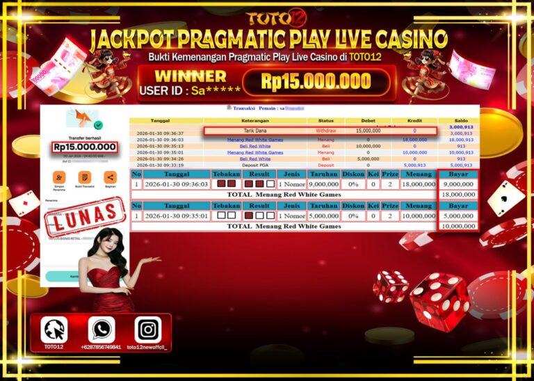 HANYA DI TOTO12 JP PASTI DI BAYAR LUNAS DAN CEPAT!!!!!! JACKPOT PRAGMATIC PLAY LIVE CASINO (RED WHITE) Rp.15.000.000 !!!!